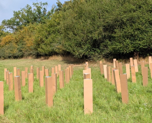 Frisch gepflanzt! Als großflächiges Projekt platziert, lässt sich Großes erahnen. 99 Dreieckssäulen erstrecken sich über ein großes Areal, in der Anmutung erinnernd an Wuchshüllen, um junge Setzlinge zu schützen. Soll hier ein Wald entstehen? Was wird hier tatsächlich aufgeforstet? Man darf irritiert sein, dann genau hinzuschauen und zu hinterfragen, das gehört zu meinem Konzept. Hier dürfen erstmal 99 Gedanken um die Ecke ranken, denn die Dreiecksobjekte bestehen aus gebrauchten Wahlplakaten. Die Rückseiten der Plakate sind nach außen gerichtet, die Innenseiten lassen nur ein Himmelblau aus den Plakatmotiven erkennen. Die zarten Pflänzchen im Sinne von frischen Ideen sollen in den Himmel wachsen!